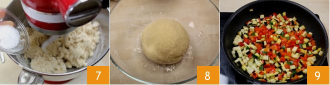 Lastly, add the salt 7 and knead the mixture until smooth and homogeneous. Transfer it to a large bowl sprinkled with a little flour 8 and let it rise covered with plastic wrap at a temperature of 80-82°F for at least 2 hours. Meanwhile, in a pan, sauté the diced zucchini, peppers, and eggplant for a few minutes 9 (they should be softened but still firm).