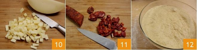Then cut the caciocavallo cheese 10 and the spicy salami 11 into cubes. After the necessary time, take the dough which will have doubled in volume 12.