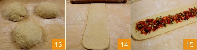 Divide it into three equal parts 13 and roll each into an oval 20 inches long and 6 inches wide 14. Place the three different fillings in the center of the three dough ovals: the vegetables 15