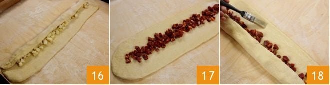 the caciocavallo cheese 16 and the spicy salami 17; brush the edges with water using a kitchen brush 18