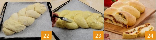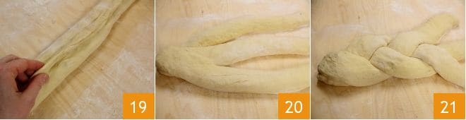 and seal each dough oval so that the filling does not spill out during cooking 19. Then join the three strands of leavened dough at one end 20 and braid them together 21.