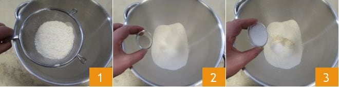 To prepare the savory brioche, start by weighing all the ingredients, they should all be at the same temperature. At this point, sift the flour into the bowl of a stand mixer 1, add the dry yeast 2 and the sugar 3.