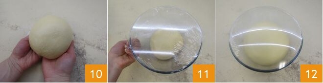 At this point, form a ball 10 and transfer the dough into a large bowl. Cover with plastic wrap and let it rise for about 3 hours in the oven turned off with only the light on. If you prefer not to use plastic wrap, you can place the dough on a cutting board and cover it with a large inverted bowl: you still need to prevent it from getting air because a crust would form on the surface. Once it has doubled in size 12
