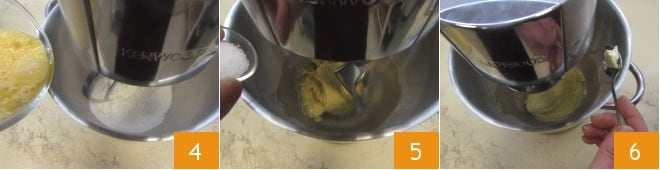 Beat the eggs in a bowl, then turn on the stand mixer equipped with a whisk at moderate speed and pour in the eggs in a stream 4. Once they are well mixed, change the whisk for the dough hook, add the salt 5 and then the softened butter one piece at a time 6, waiting for it to be absorbed before proceeding with another.