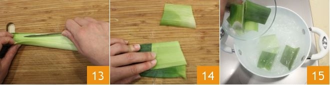 Peel the leek 13 and cut the green part into a trapezoid shape measuring about 2x1.75x2.5 inches 14, blanch them for a few minutes 15