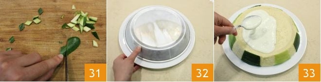 Also cut the slices of zucchini set aside into diamonds slightly smaller than the carrots because they will be overlaid on them later 31. Everything is ready to assemble the cassata: on a serving plate, invert the now set base 32, adhere the leek leaves to the edge, spacing them apart, spread the surface with the béchamel sauce 33, and keep the remaining in the refrigerator,