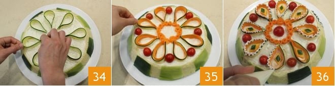 fold the zucchini to create petals and place them on the outermost part of the cake to create a flower pattern 34; you will need 8 slices of zucchini, insert carrots inside each petal, place a cherry tomato between each petal 35, then create a circle with the carrot roses and place a cherry tomato in the center. Continue by inserting a cheddar diamond and a smaller zucchini diamond inside each petal. Finally, transfer the remaining béchamel to a piping bag with a small tip and trace the outline of the vegetables both on top and on the sides, creating a scalloped border 36. Your savory cassata is ready to impress your guests!