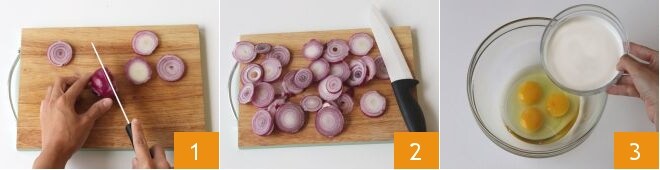 To make the savory red onion clafoutis, first clean and slice the onions into 1/8-inch thick slices (1-2): you will need about 9 oz of sliced onions. Move on to preparing the batter: pour the eggs into a large bowl and add the cream 3