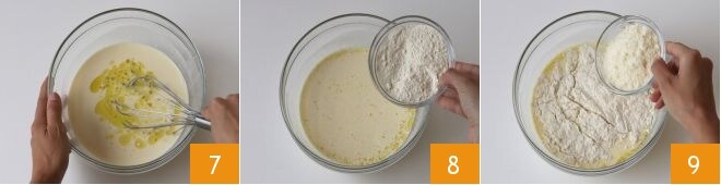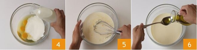 and the milk 4 and mix everything together with a whisk 5. Add the olive oil 6