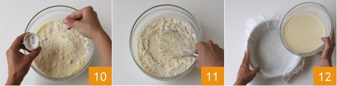 salt 10, pepper, and mix with the whisk 11 until you get a smooth and homogeneous consistency. Line a 9-inch baking dish with parchment paper and pour the mixture inside 12.
