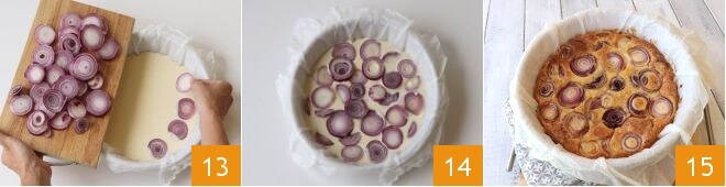 Lay the onion slices on the mixture 13, distributing them evenly over the entire surface 14, then bake in a preheated static oven at 350°F for about 40-50 minutes until golden brown 15. Your savory clafoutis is ready to be enjoyed!