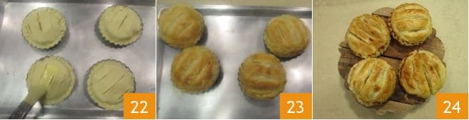 Beat the yolk with a little milk in a small bowl and brush the mini pies with the resulting mixture 22, then bake in a preheated static oven at 350°F for 20-25 minutes, until they are nicely golden 23. Your savory mini cheese and apple pies are ready to be served while still warm 24!