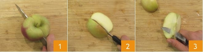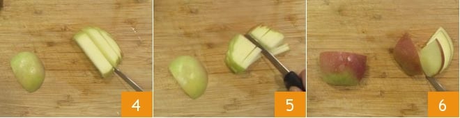 Cut two quarters of the apple into sticks 4 and divide the sticks in half 5. Finally, cut the remaining two quarters of the apple into rather thin slices (you will need 12 slices) 6.