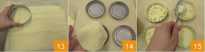 Now roll out the first sheet of puff pastry and cut out 4 disks using a 4-inch diameter pastry cutter 13. Butter 4 tartlet molds with a diameter of 3 inches and line them with the pastry disks you just cut out 14, making sure to press well on both the base and the edges. Distribute a tablespoon of the egg and cheese mixture for each tartlet 15,