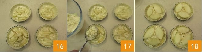 then add about half a tablespoon of the apple cut into sticks 16 and cover with another layer of the cheese and egg mixture 17. Finish by placing 3 thin slices of apple on top of each tartlet 18.