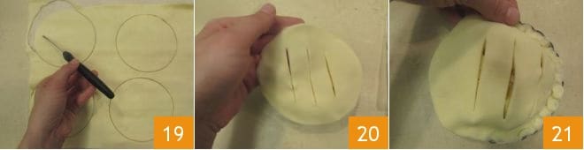 At this point, roll out the second sheet of puff pastry and cut out another 4 disks with the same 4-inch diameter pastry cutter, then use a small knife to make 3 cuts in the center, being careful not to cut through to the edges (19-20). Place the cut-out pastry disk on each tartlet to cover the filling and press along the edges with your fingers to seal it 21.