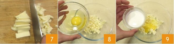 Cut the provolone into slices and then into cubes 7, transfer them to a bowl and add the whole egg 8, the yolk, and the cream 9.
