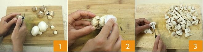 To prepare the savory polenta tart, start with the ingredients that will make up the filling. First, take care of cleaning the mushrooms: remove any soil residue from the porcini mushrooms and champignon mushrooms (1-2). Once cleaned and washed, cut the mushrooms into quarters 3 and set them aside in a bowl.