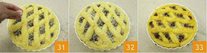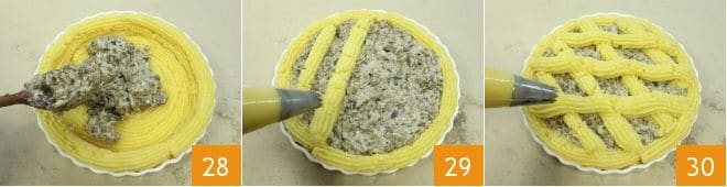 Now pour the filling in the center 28 and even it out with the back of a wooden spoon. Using the piping bag again, create the classic lattice pattern of the tart (29-30).