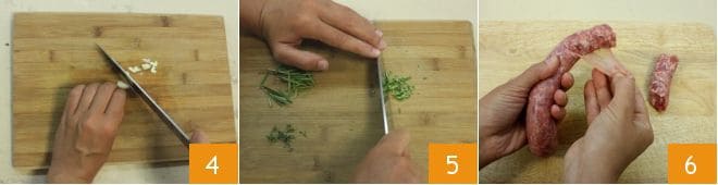 Now peel a clove of garlic and chop it finely 4, then strip the rosemary and thyme sprigs and chop the needles and leaves finely 5. Finally, gently cut the sausage casing and crumble it 6, removing the skin and collecting the meat in a bowl.
