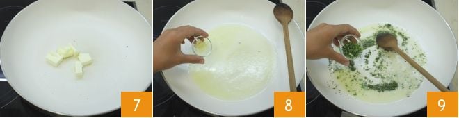 At this point, melt the butter in a large pan 7, add the chopped garlic 8 and the chopped rosemary and thyme 9, and let it sauté over a low heat for a few minutes.
