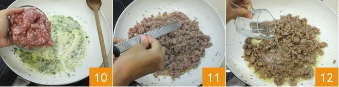 Add the sausage to the pan and let it cook for 10 minutes 10. During cooking, season everything by grating nutmeg 11, you can add the powdered one directly if you wish, and deglaze with white wine 12.