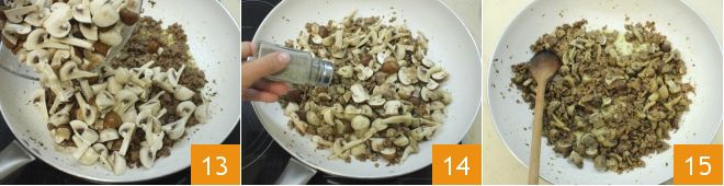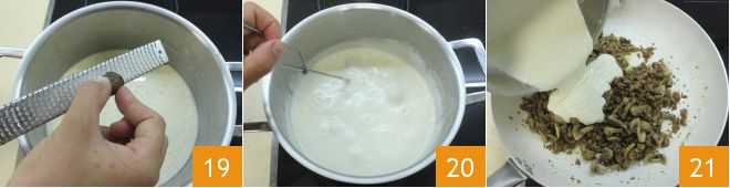 Season with a pinch of salt and pepper and a sprinkle of grated nutmeg 19 or powdered, then put a lid on the pot and let it cook for about 15 minutes, until the béchamel sauce has thickened 20. To prepare and store the béchamel sauce at best, consult our recipe Béchamel sauce. Once ready, pour the béchamel sauce into the sausage and mushroom filling 21 and mix to combine everything.
