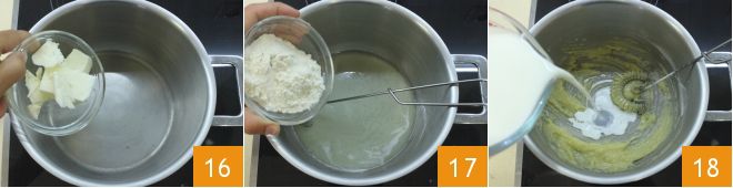 Prepare the béchamel sauce now: pour the butter into a saucepan with high sides 16 and let it melt over low heat. Once melted, add the flour already sifted 17 and let it cook for a few minutes, continuing to stir to prevent the flour from sticking to the bottom. Then add the milk 18, which you have previously heated, and continue stirring.