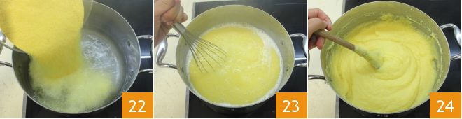 Take care of the polenta: fill a large pot with water, salt it, pour a drizzle of oil and bring it to a boil. Then, pour the polenta in a rain 22 and start stirring vigorously with a whisk 23. Continue stirring with a wooden spoon until the polenta has reached a thick consistency 24. Turn off the heat and let it cool. To discover how to prepare and store polenta at best, consult the recipe Polenta.