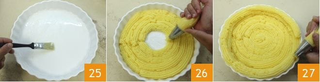 Meanwhile, grease a 10.5-inch tart pan with butter, using a brush 25, then transfer the polenta into a piping bag with a star tip and create the base of the tart by forming concentric circles 26. Finally, draw the edge of the tart by squeezing the polenta along the perimeter of the tart pan 27.