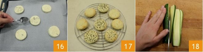 and place them on a baking sheet lined with parchment paper. Sprinkle some with white sesame seeds, others with black ones, and the rest with poppy seeds 16. Place the baking sheet in the refrigerator to rest the disks for another 10-15 minutes before baking them in a static oven preheated to 392°F for about 15-20 minutes (356°F for 10-15 minutes if using a convection oven). Once cooked, they should be golden on the surface (you can check the doneness by sticking them with a toothpick: if it comes out dry, they are cooked); you can remove them from the oven and let them cool completely on a rack. Meanwhile, for the filling, wash and trim a zucchini, then slice it into rather thin slices with a knife 18 or with a mandoline.