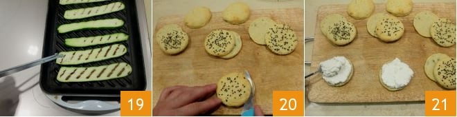 Heat the grill very well and grill the zucchini on both sides 19; then when the scones are cold, open them halfway horizontally with a small knife 20 and fill 6 halves with ricotta 21,