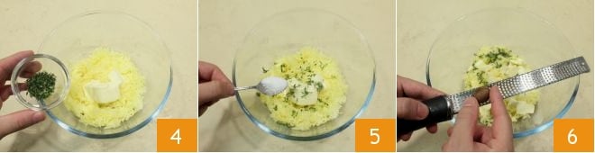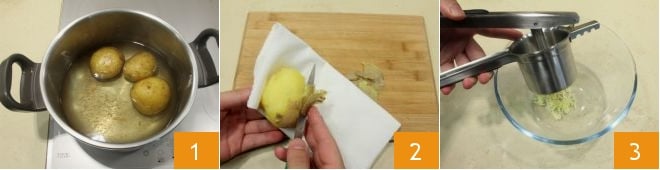 To prepare the savory potato scones, start with the potatoes: wash them under running water, then boil them in a large pot with plenty of lightly salted water 1: it will take about 30 minutes to cook until soft (you can reduce the time by using a pressure cooker, which will take about 12 minutes); once cooked, peel them while still hot 2 and mash them in a bowl 3.