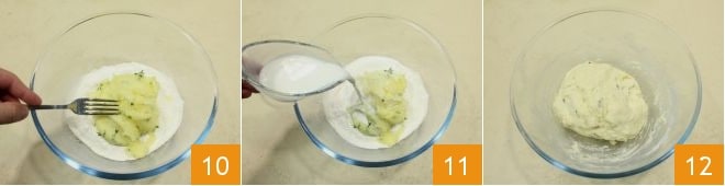 When the potato mixture is cold, pour it into the bowl with the flour and baking powder 10 and also add the milk a little at a time 11, then mix all the ingredients: you should obtain a compact and homogeneous dough. Then form a ball of dough 12 and place it in the fridge to firm up, covered with plastic wrap, for about 20 minutes.