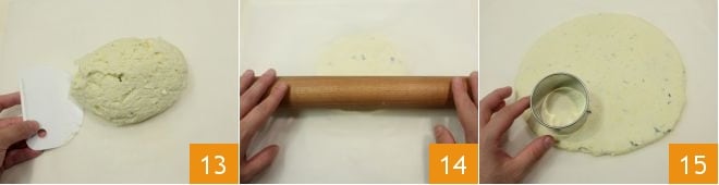 After this time, turn the dough out onto a lightly floured work surface, place a sheet of parchment paper on top and roll out the dough into a disk of 0.6 inches thickness 14; then remove the sheet of parchment paper and use a 2.5-inch diameter biscuit cutter to cut out 12 disks 15