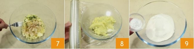 mix everything with a fork 7, then cover with plastic wrap and let it cool to room temperature, then in the fridge 8. Then, sift the flour into a bowl and add the baking powder for savory preparations 9.