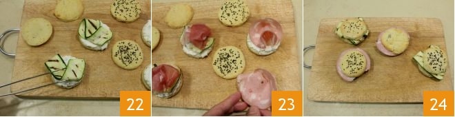 then place the grilled zucchini 22 or the prosciutto or mortadella on the halves with ricotta 23; close them with the other halves, and your savory potato scones are ready to be enjoyed 24!