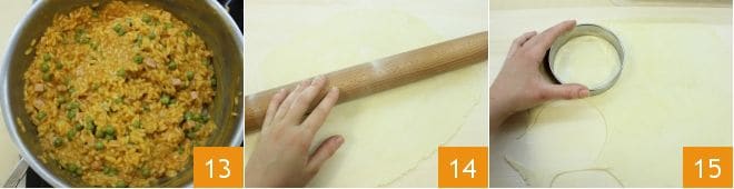 Let the risotto cool 13 and roll out the pastry to about 1/8 inch 14, cut out circles using a pastry cutter with a diameter of about 4.75 inches 15