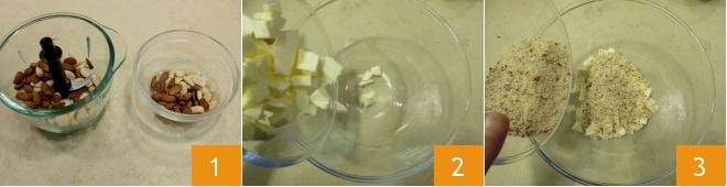 To prepare the savory sbrisolona, place both types of almonds in a mixer 1 and coarsely blend them. At this point, cut the butter into cubes and transfer it into a fairly large bowl 2. Also add the almonds 3,