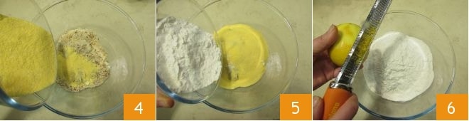 the fine cornmeal 4 and the all-purpose flour 5. Then add the grated zest of one lemon 6,