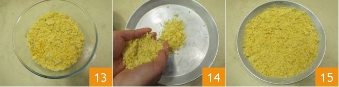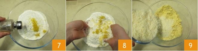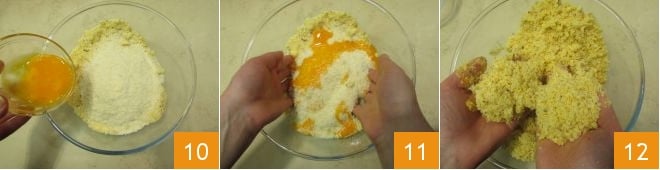 and the egg yolks 10. Mix again with your hands without kneading 11 but using only your fingertips to obtain a crumbly mixture 12.