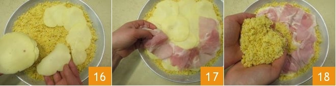 Cut the provolone cheese into slices and place them on top of the mixture 16, then add the slices of cooked ham 17 and cover with the dough crumbs 18, spreading them over the entire surface.