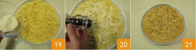 Finish with a sprinkle of Parmesan 19 and a pinch of black pepper 20. Bake in a preheated static oven at 356°F and cook the savory sbrisolona for 50 minutes. Then remove from the oven 21 and serve it still warm.