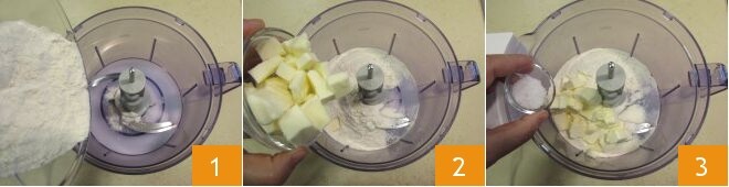 and the egg 4. Close with the lid and start the processor until you get a crumbly mixture 5. Transfer the mixture to a pastry board and quickly work it with your hands 6