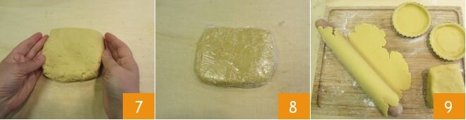 to form a dough ball 7. Wrap the dough ball in plastic wrap 8 and let it rest in the refrigerator for at least an hour. After this time, you can roll out your savory shortcrust pastry on a lightly floured surface to make a tart or tartlets 9!