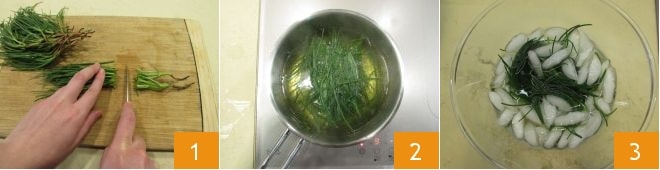 To prepare the savory tartlets with agretti, start by cleaning the agretti, removing the more earthy and tough ends 1. Once you have about 4.6 oz of them, blanch them for 30 seconds in boiling water 2, then drain and immediately transfer them to a bowl with ice water 3 to set the color.