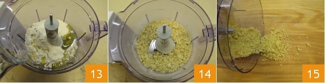 and the cold water 13. Then blend it until you get a crumbly mixture: it will take just a few moments 14, then transfer it to a work surface 15.