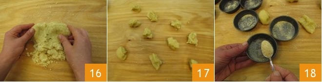 Compact it with your hands 16 and divide it into 10 portions 17 which will be used to make the 10 tartlets. Grease and sprinkle with breadcrumbs 10 molds with a diameter of about 3 inches 18.
