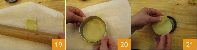 Then roll out the individual portions of dough one at a time 19 and cut out 4.5-inch discs using a pastry cutter 20; you can add scraps to another piece to roll out, continuing in this way for all the tartlets. Transfer each dough disc inside the mold 21 and let it adhere well to the bottom and sides.
