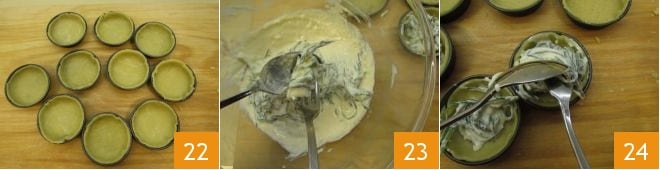 Once you have lined all the molds 22, prick them with a fork and transfer a little cream with the agretti inside them, rolling them with a fork and a spoon, adding a bit more cream to each mold (23-24).
